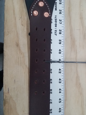 Care: Oil the belt, especially the main three inch piece periodically to keep the leather soft and supple while also helping to shed moisture. We use (and sell) Pecard leather products here in the shop but there are several comparable leather care brands out there to choose from.